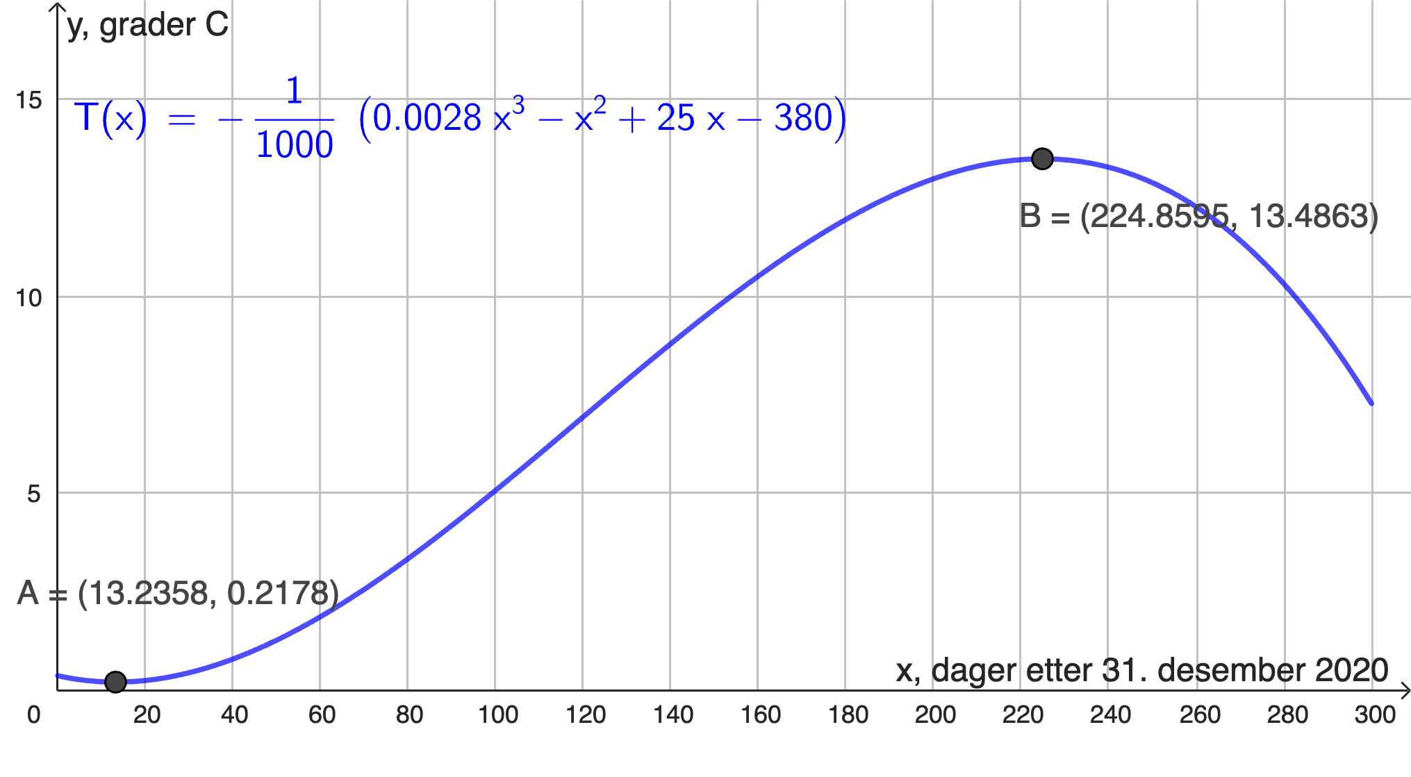 Vi regner ut temperaturen for disse dagene i GeoGebra: