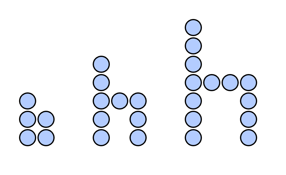 Ovenfor ser du tre figurer. Figurene er satt sammen av små sirkler. Tenk deg at du skal fortsette å lage figurer etter samme mønster.